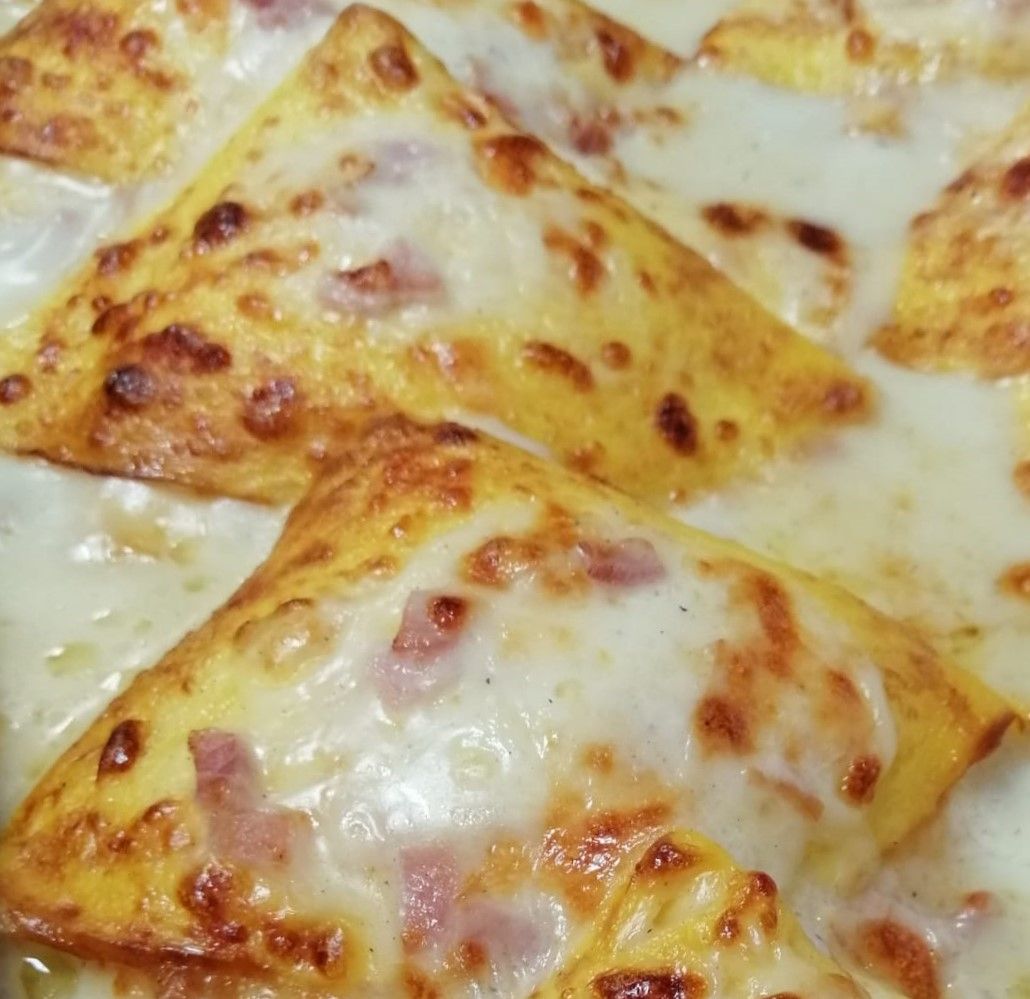 Crespelle artigianali con pasta fresca all'uovo di nostra produzione, farcite con prosciutto cotto e brie