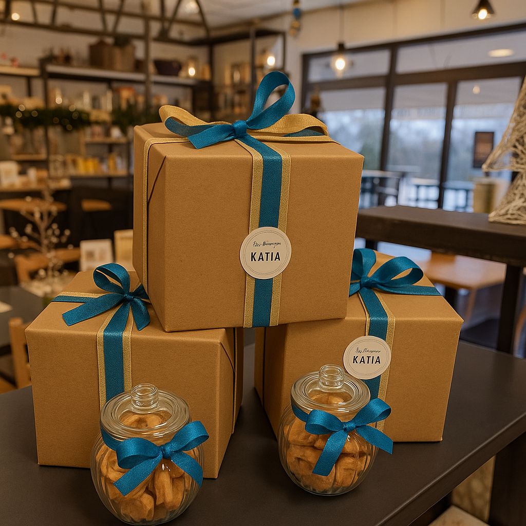 Confezione con il nostro panettone artigianale special edition 2025: fave di tonka, ruhm, vaniglia e pere, bottiglia per il brindisi, torroncini e una confezioni della nostra pasticceria secca